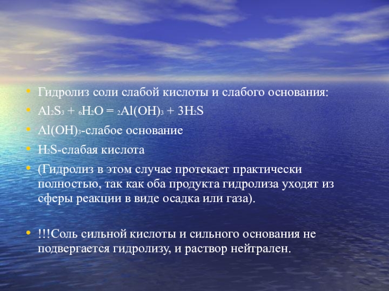 Гидролиз соли слабой кислоты и слабого основания:Al2S3 + 6H2O = 2Al(OH)3 + 3H2SAl(OH)3-слабое основаниеH2S-слабая кислота(Гидролиз в этом