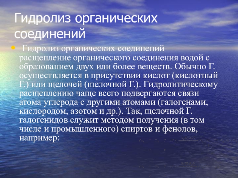 Гидролиз органических соединений Гидролиз органических соединений — расщепление органического соединения водой с образованием двух или более веществ.