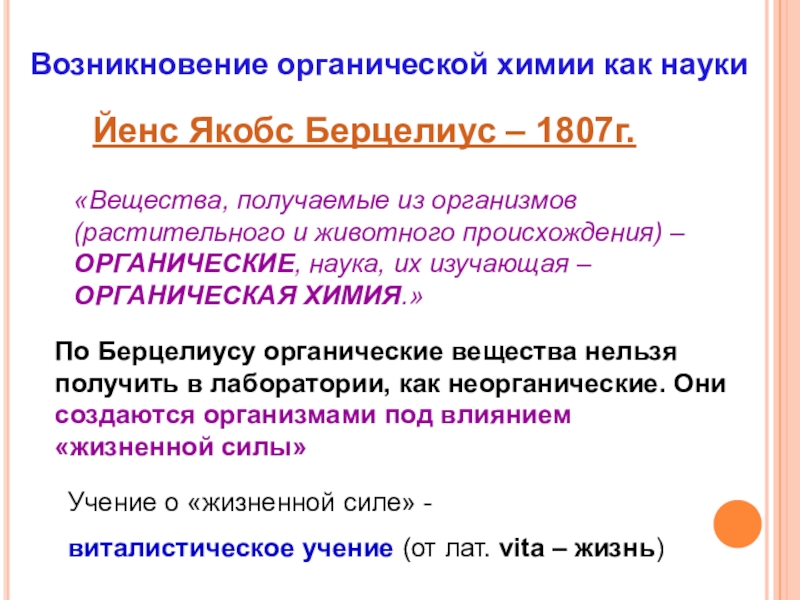 По Берцелиусу органические вещества нельзя получить в лаборатории, как неорганические. Они создаются организмами под влиянием «жизненной силы»
