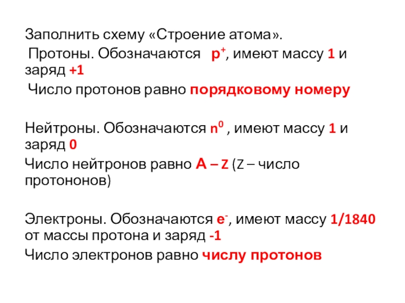 Электроны. Обозначаются е-, имеют массу 1/1840 от массы протона и заряд -1