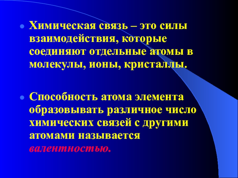 Способность атома элемента образовывать различное число химических связей с другими атомами называется валентностью.