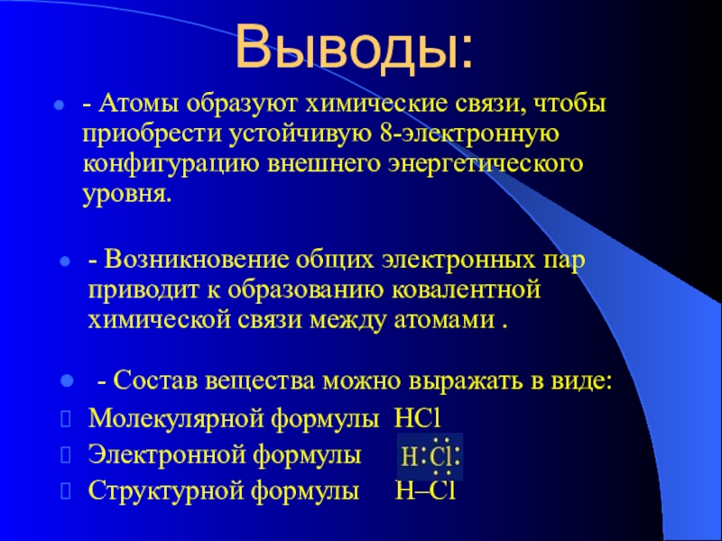 - Атомы образуют химические связи, чтобы приобрести устойчивую 8-электронную конфигурацию внешнего энергетического уровня.