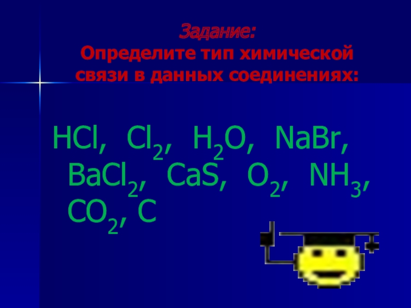 Задание: Определите тип химической связи в данных соединениях:  HCl, Cl2, H2O, NaBr, BaCl2, CaS, O2, NH3, CO2, C