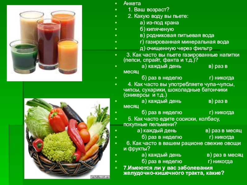Анкета  1. Ваш возраст?  2. Какую воду вы пьете:      а)
