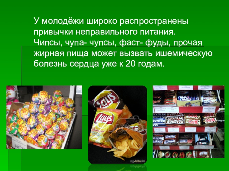 У молодёжи широко распространены привычки неправильного питания.Чипсы, чупа- чупсы, фаст- фуды, прочая жирная пища может вызвать ишемическую