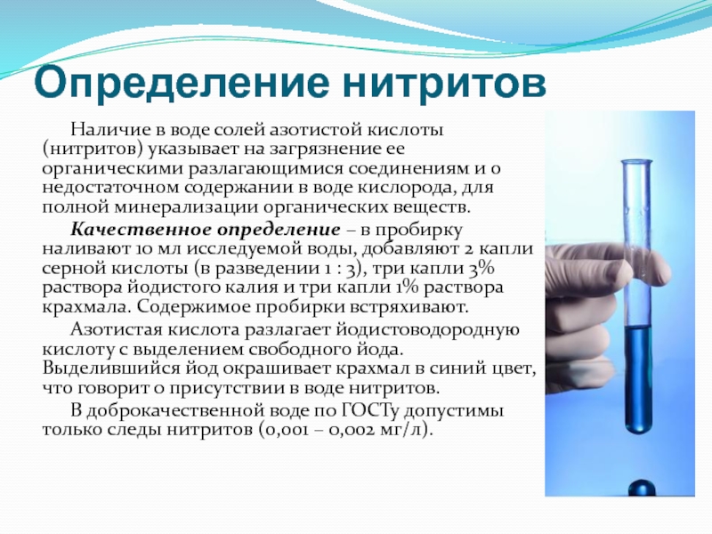 В доброкачественной воде по ГОСТу допустимы только следы нитритов (0,001 – 0,002 мг/л).