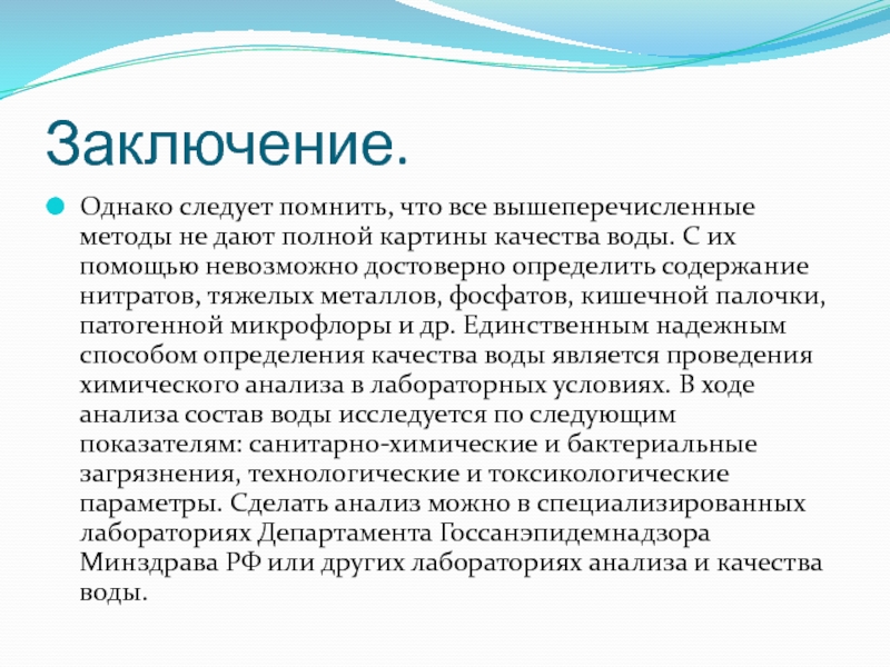 качества воды. С их помощью невозможно достоверно определить содержание нитратов, тяжелых металлов, фосфатов, кишечной палочки, патогенной микрофлоры и др. Единственным надежным способом определения качества воды является проведения химического анализа в лабораторных условиях. В ходе анализа состав воды исследуется по следующим показателям: санитарно-химические и бактериальные загрязнения, технологические и токсикологические параметры. Сделать анализ можно в специализированных лабораториях Департамента Госсанэпидемнадзора Минздрава РФ или других лабораториях анализа и качества воды.