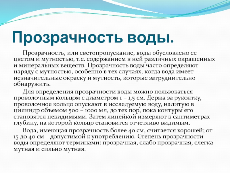 Вода, имеющая прозрачность более 40 см, считается хорошей; от 15 до 40 см – допустимой к употреблению. Степень прозрачности воды определяют терминами: прозрачная, слабо прозрачная, слегка мутная и сильно мутная.