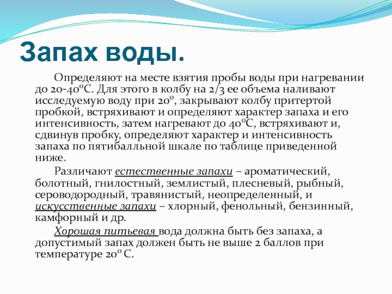 Хорошая питьевая вода должна быть без запаха, а допустимый запах должен быть не выше 2 баллов при температуре 200 С.