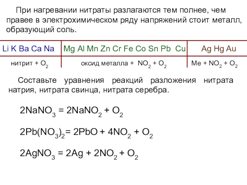 Составьте уравнения реакций разложения нитрата натрия, нитрата свинца, нитрата серебра.