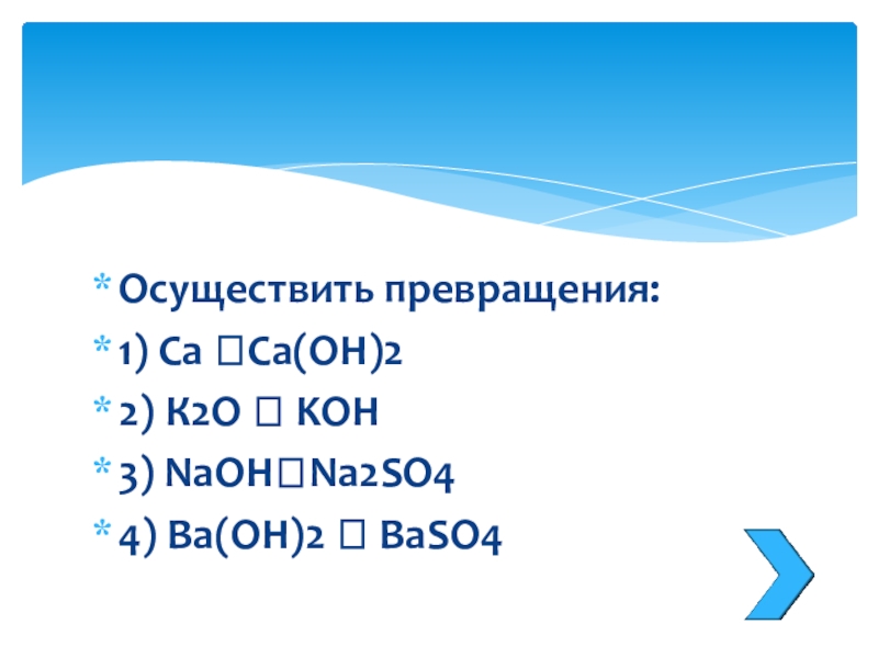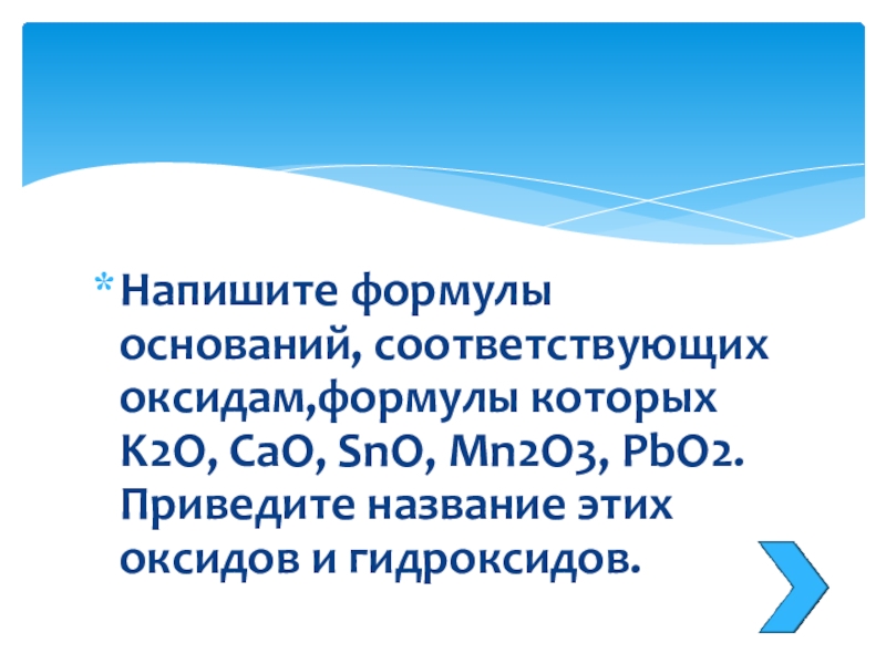 Слайд 17Напишите формулы оснований, соответствующих оксидам,формулы которых K2O, CaO, SnO, Mn2O3, PbO2.Приведите