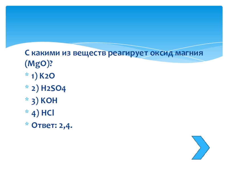 Слайд 12С какими из веществ реагирует оксид магния (MgO)?