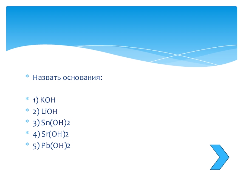 NaOH гидроксид натрия, Ca(OH)2 гидроксид кальция, KOH гидроксид калия.