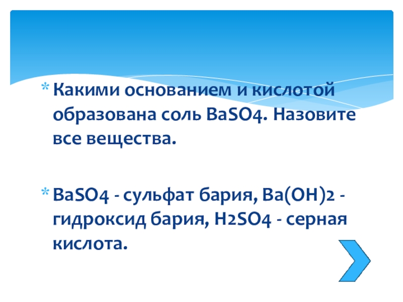 Слайд 25Какими основанием и кислотой образована соль BaSO4. Назовите все вещества.