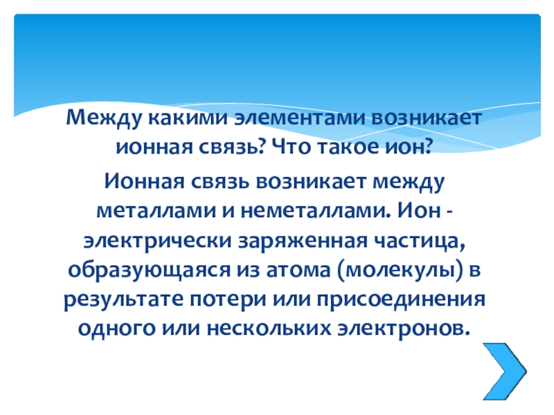 Слайд 29Между какими элементами возникает ионная связь? Что такое ион?