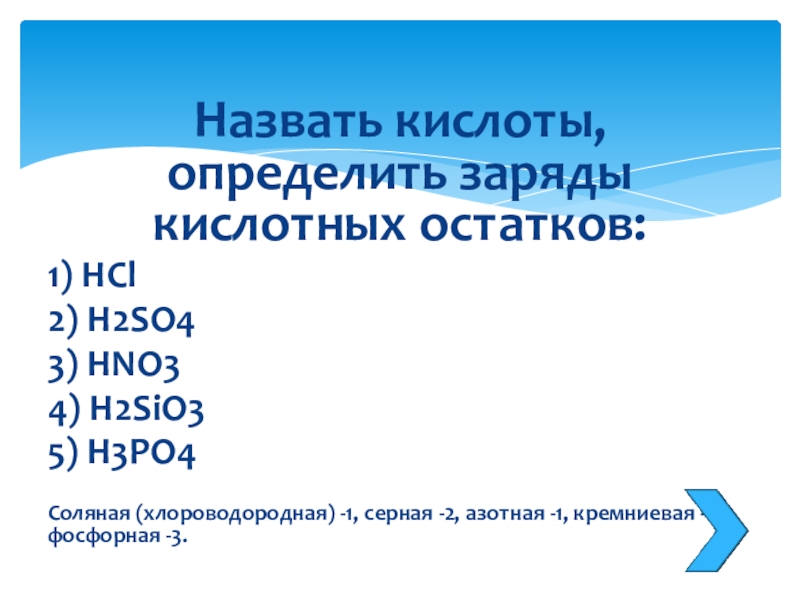 Слайд 20Назвать кислоты, определить заряды кислотных остатков:
