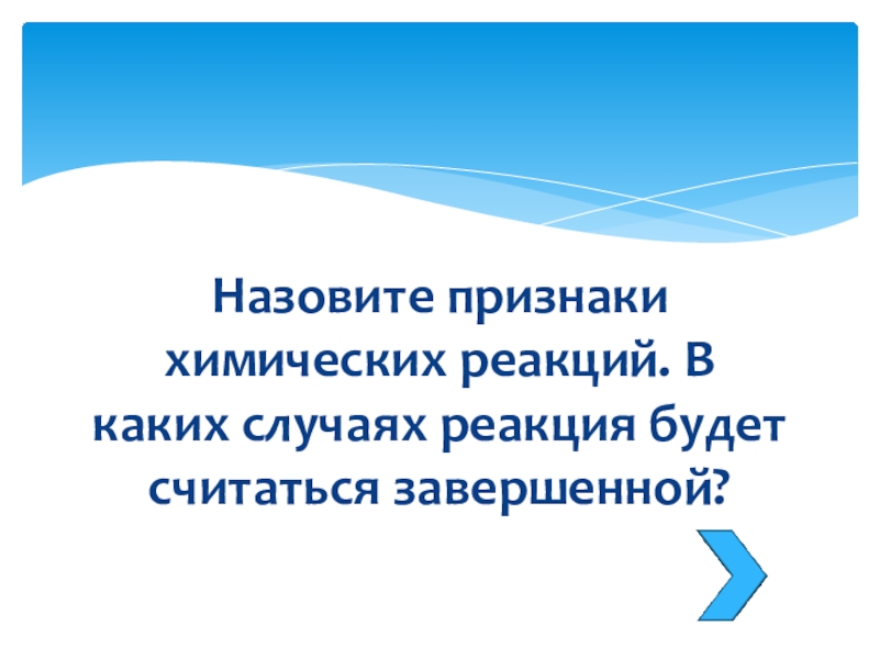 Слайд 32Назовите признаки химических реакций. В каких случаях реакция будет считаться завершенной?