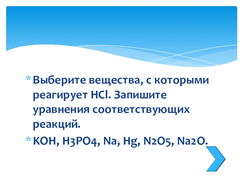 Слайд 22Выберите вещества, с которыми реагирует HCl. Запишите уравнения соответствующих реакций.