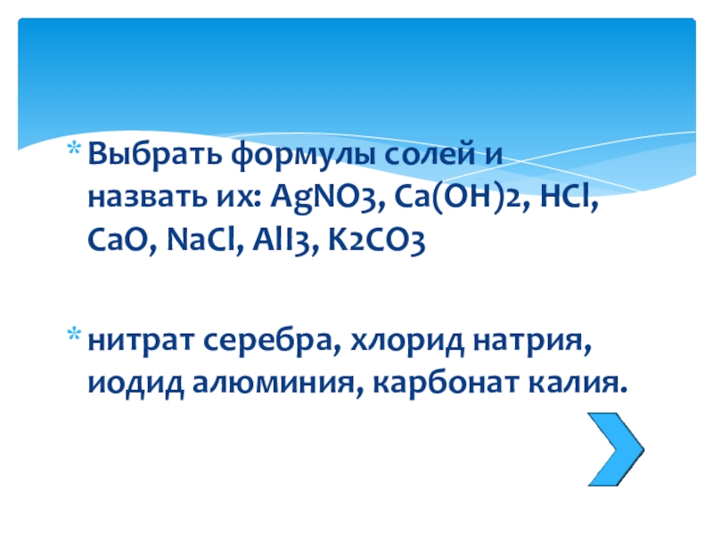 Слайд 24Выбрать формулы солей и назвать их: AgNO3, Ca(OH)2, HCl, CaO, NaCl,