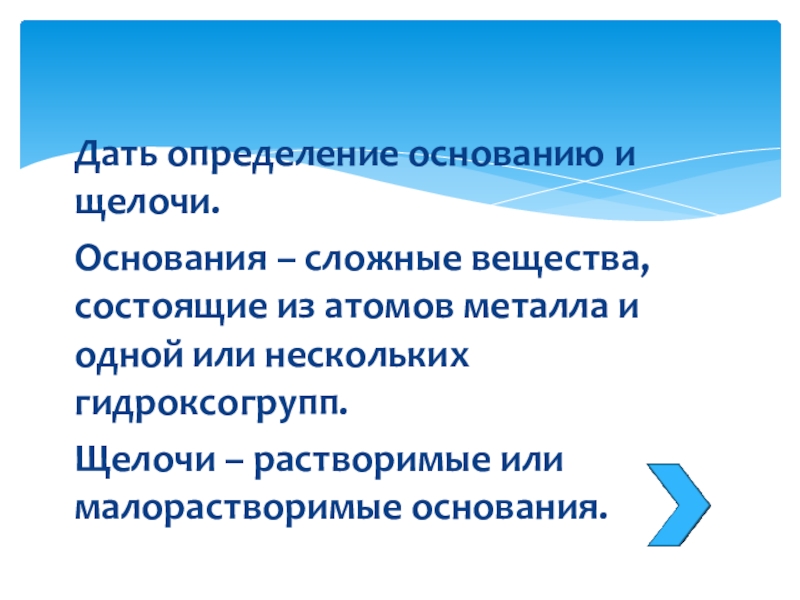 Слайд 5Дать определение основанию и щелочи.