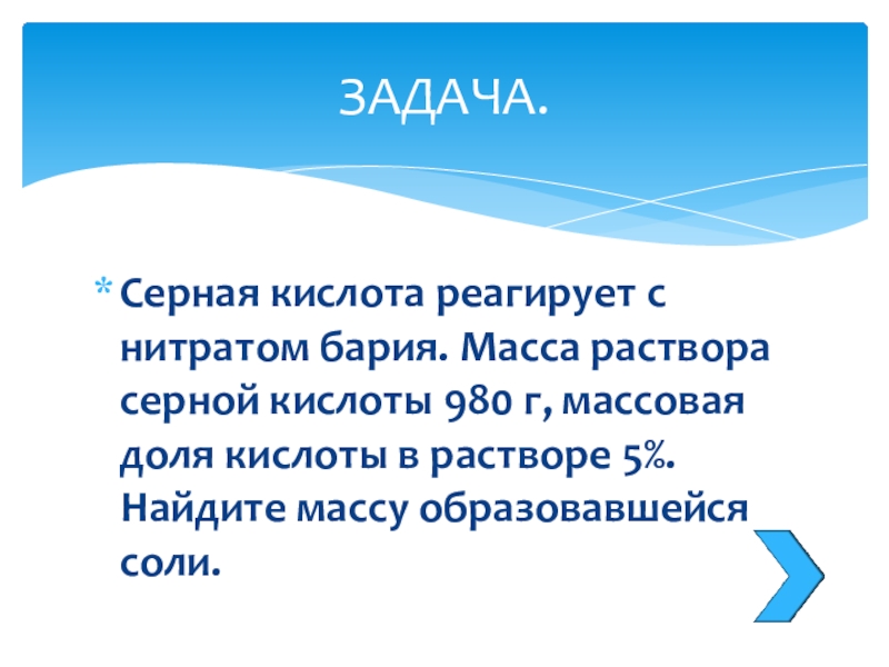 Слайд 28Серная кислота реагирует с нитратом бария. Масса раствора серной кислоты 980