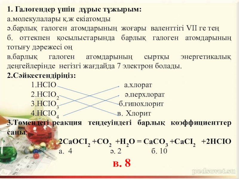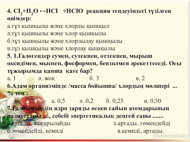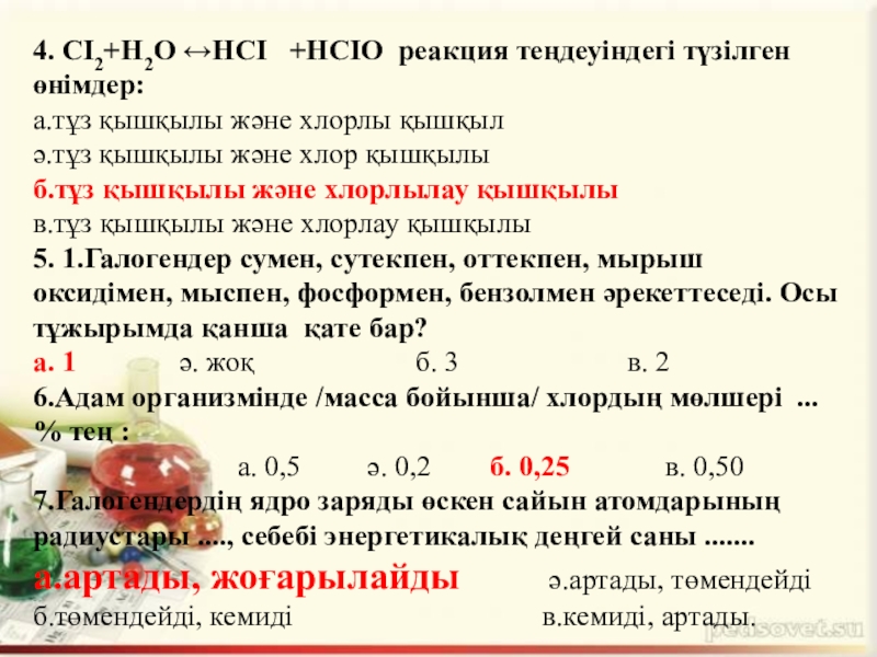 Слайд 24. СІ2+Н2О ↔НСІ +НСІО реакция теңдеуіндегі түзілген өнімдер: