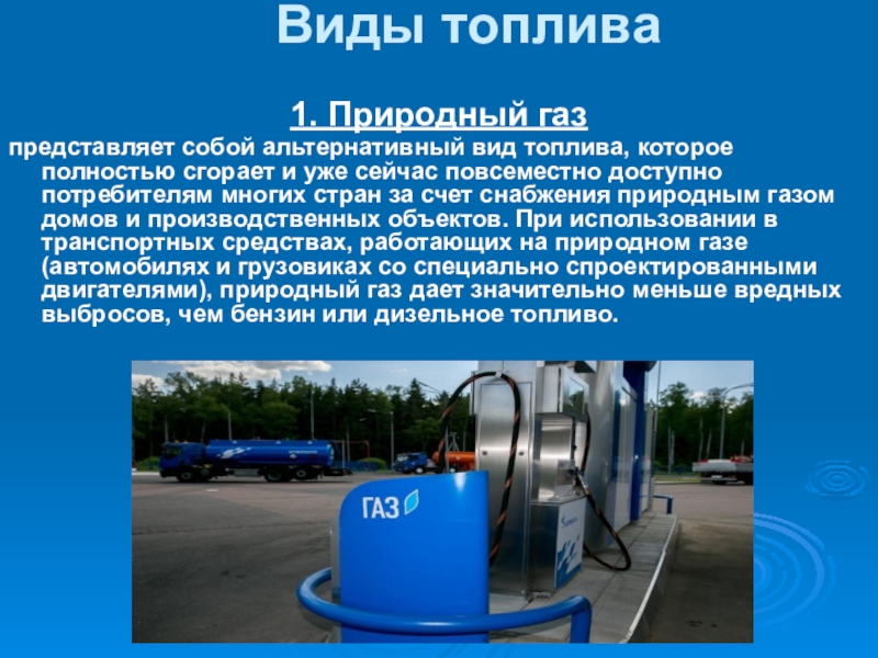 сгорает и уже сейчас повсеместно доступно потребителям многих стран за счет снабжения природным газом домов и производственных объектов. При использовании в транспортных средствах, работающих на природном газе (автомобилях и грузовиках со специально спроектированными двигателями), природный газ дает значительно меньше вредных выбросов, чем бензин или дизельное топливо.