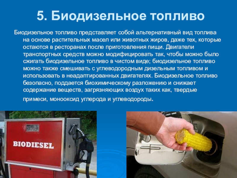 растительных масел или животных жиров, даже тех, которые остаются в ресторанах после приготовления пищи. Двигатели транспортных средств можно модифицировать так, чтобы можно было сжигать биодизельное топливо в чистом виде; биодизельное топливо можно также смешивать с углеводородным дизельным топливом и использовать в неадаптированных двигателях. Биодизельное топливо безопасно, поддается биохимическому разложению и снижает содержание веществ, загрязняющих воздух таких как, твердые примеси, монооксид углерода и углеводороды.
