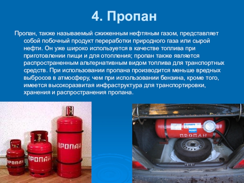 переработки природного газа или сырой нефти. Он уже широко используется в качестве топлива при приготовлении пищи и для отопления; пропан также является распространенным альтернативным видом топлива для транспортных средств. При использовании пропана производится меньше вредных выбросов в атмосферу, чем при использовании бензина, кроме того, имеется высокоразвитая инфраструктура для транспортировки, хранения и распространения пропана.