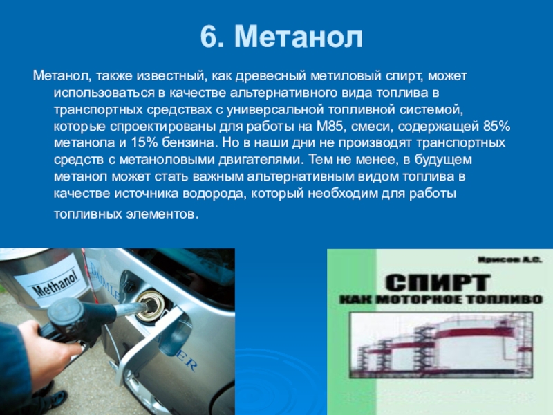 качестве альтернативного вида топлива в транспортных средствах с универсальной топливной системой, которые спроектированы для работы на M85, смеси, содержащей 85% метанола и 15% бензина. Но в наши дни не производят транспортных средств с метаноловыми двигателями. Тем не менее, в будущем метанол может стать важным альтернативным видом топлива в качестве источника водорода, который необходим для работы топливных элементов.