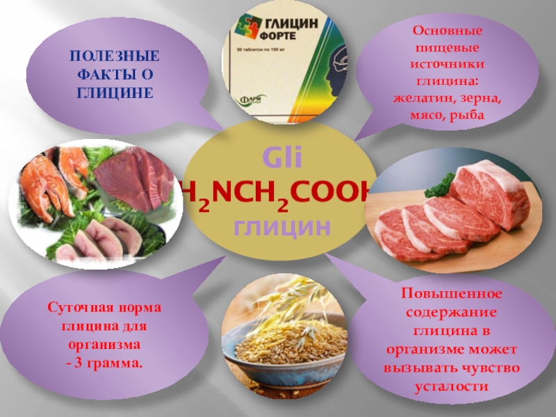Основные пищевые источники глицина: желатин, зерна, мясо, рыба