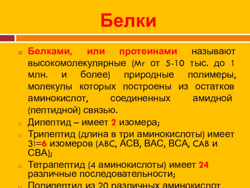 Полипептид из 20 различных аминокислот имеет 1018 изомеров (Mr ≈2600).