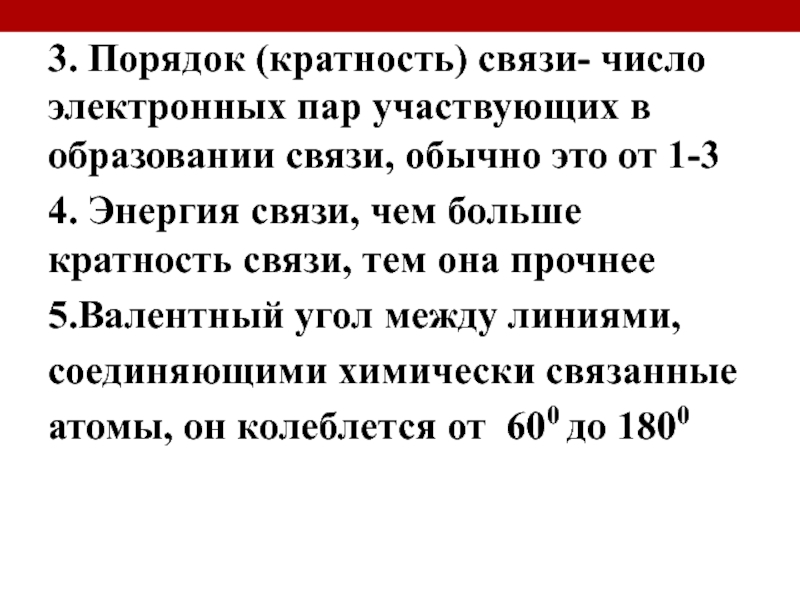 3. Порядок (кратность) связи- число электронных пар участвующих в образовании связи, обычно это от 1-34. Энергия связи,