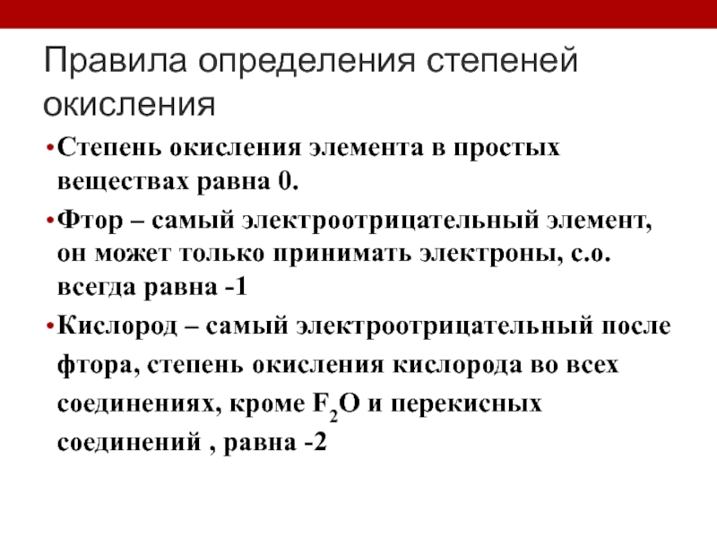Правила определения степеней окисленияСтепень окисления элемента в простых веществах равна 0.Фтор – самый электроотрицательный элемент, он может