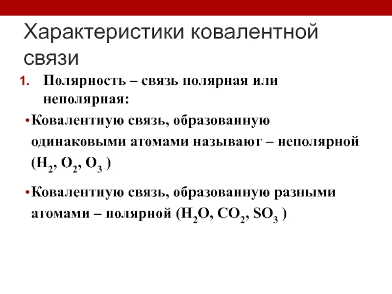 Характеристики ковалентной связиПолярность – связь полярная или неполярная:Ковалентную связь, образованную одинаковыми атомами называют – неполярной (Н2, О2,