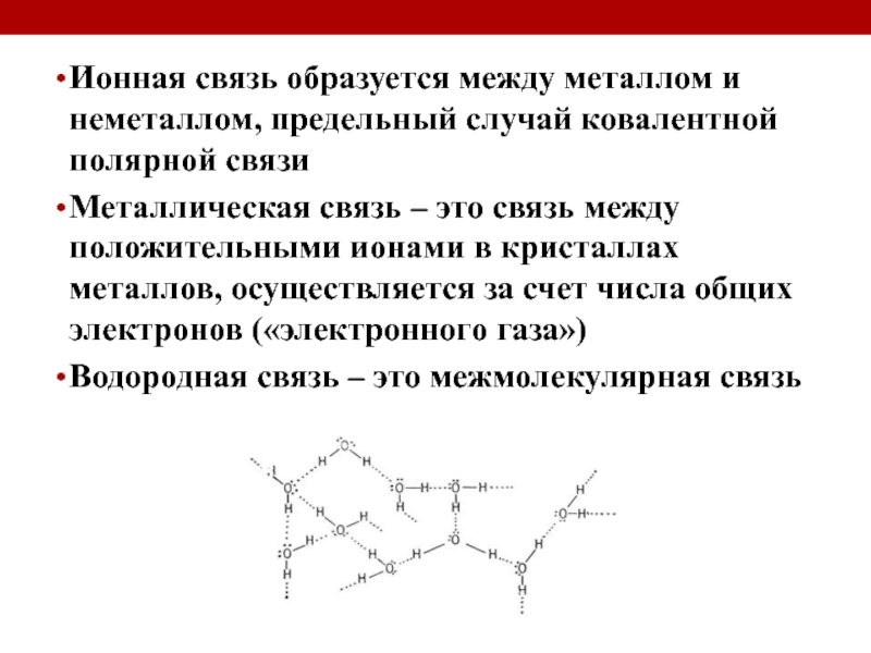 Ионная связь образуется между металлом и неметаллом, предельный случай ковалентной полярной связиМеталлическая связь – это связь между
