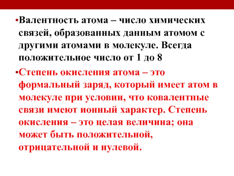 Валентность атома – число химических связей, образованных данным атомом с другими атомами в молекуле. Всегда положительное число