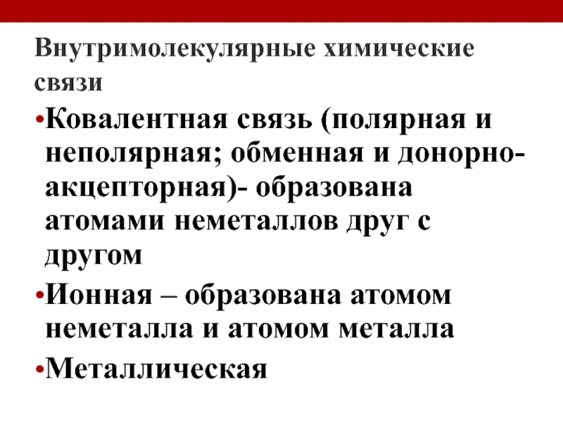Внутримолекулярные химические связиКовалентная связь (полярная и неполярная; обменная и донорно-акцепторная)- образована атомами неметаллов друг с другомИонная –