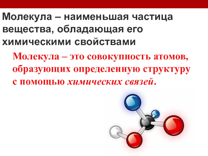 Молекула – наименьшая частица вещества, обладающая его химическими свойствамиМолекула – это совокупность атомов, образующих определенную структуру с