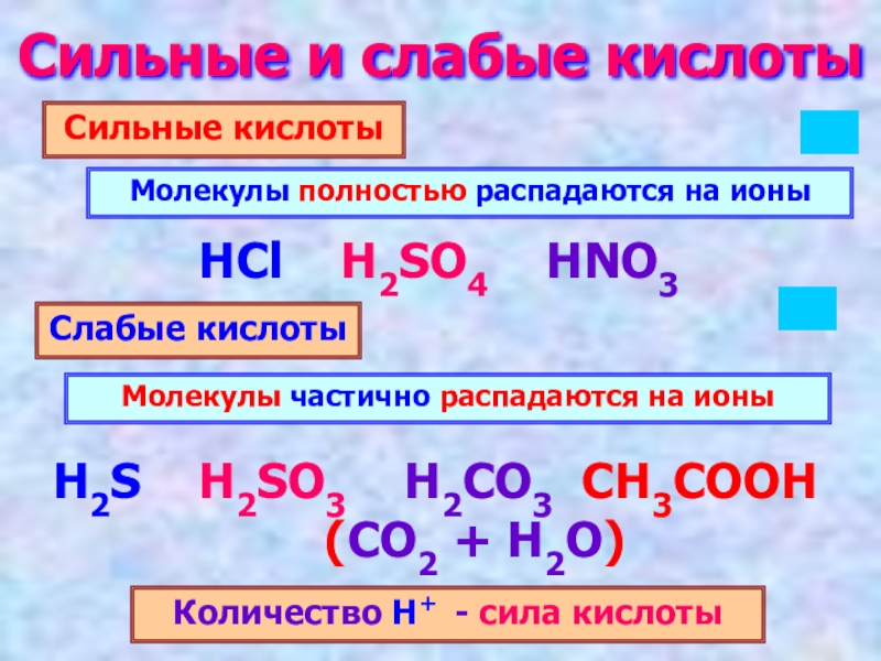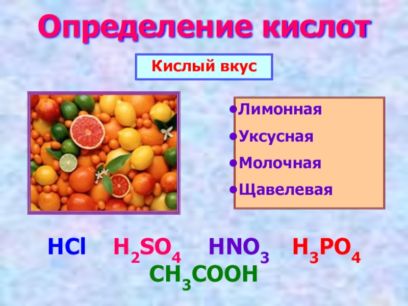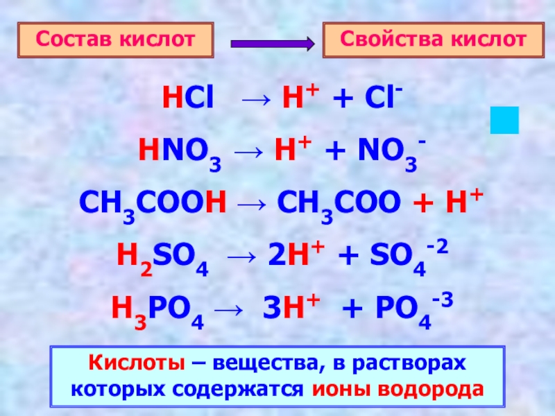 Кислоты – вещества, в растворах которых содержатся ионы водорода