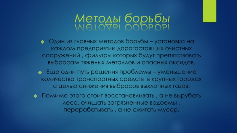 Методы борьбы Один из главных методов борьбы – установка на каждом предприятии дорогостоящих очистных сооружений , фильтры