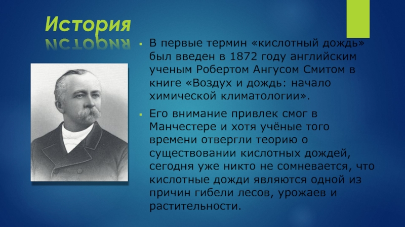 ИсторияВ первые термин «кислотный дождь» был введен в 1872 году английским ученым Робертом Ангусом Смитом в книге
