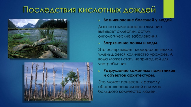 Последствия кислотных дождейВозникновение болезней у людей.Данное атмосферное явление вызывает аллергии, астму, онкологические заболевания.Загрязнение почвы и воды.Это исчерпывает
