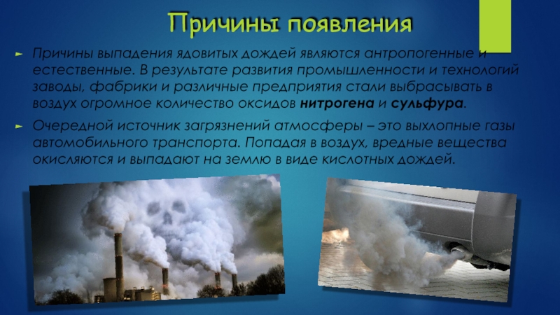 Причины выпадения ядовитых дождей являются антропогенные и естественные. В результате