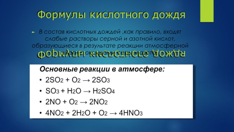 Формулы кислотного дождяВ состав кислотных дождей ,как правило, входят слабые растворы серной и азотной кислот, образующиеся в