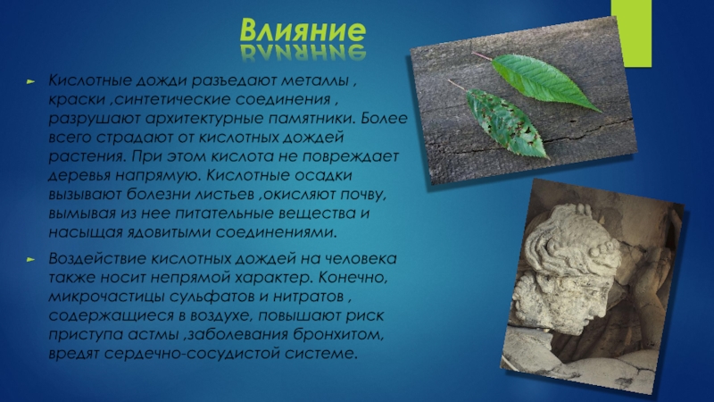 ВлияниеКислотные дожди разъедают металлы ,краски ,синтетические соединения ,разрушают архитектурные памятники. Более всего страдают от кислотных дождей растения.