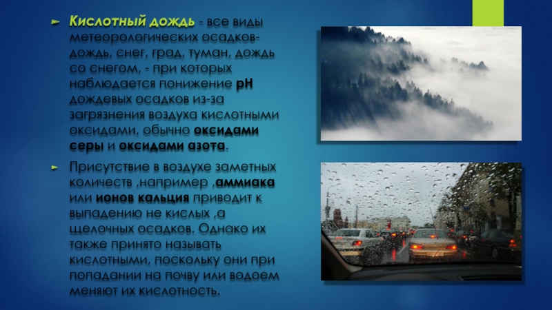 Слайд 2Кислотный дождь - все виды метеорологических осадков-дождь, снег, град, туман, дождь