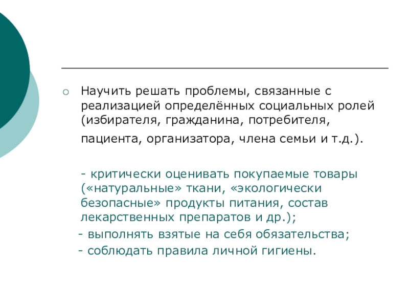 Научить решать проблемы, связанные с реализацией определённых социальных ролей (избирателя, гражданина, потребителя, пациента, организатора, члена семьи и
