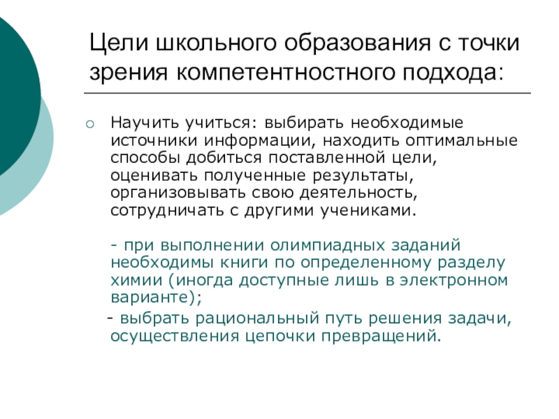 Цели школьного образования с точки зрения компетентностного подхода: Научить учиться: выбирать необходимые источники информации, находить оптимальные способы добиться поставленной цели, оценивать полученные результаты, организовывать свою деятельность, сотрудничать с другими учениками. - при выполнении олимпиадных