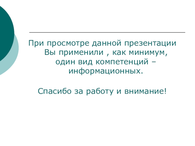 При просмотре данной презентации Вы применили , как минимум, один вид компетенций – информационных. Спасибо за работу